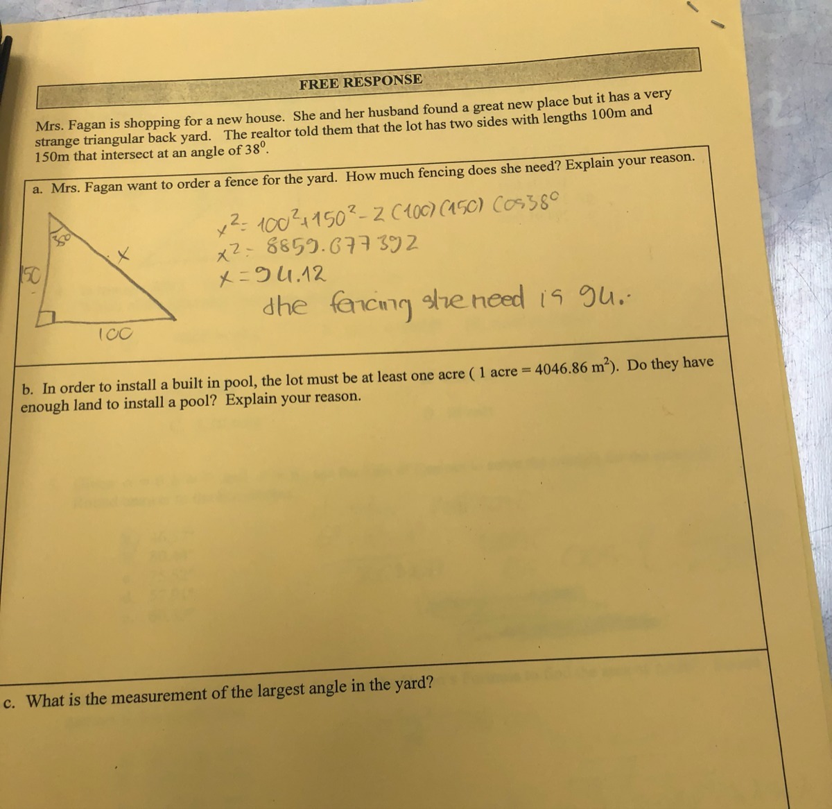 c. The largest angle in the yard will be opposite the longest side of the yard. It can be found using the law of cosines.