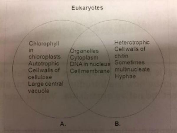 - B in the diagram represents fungi (Fungi Kingdom) due to the presence of hyphae, cell wall of chitin and being heterotrophic.