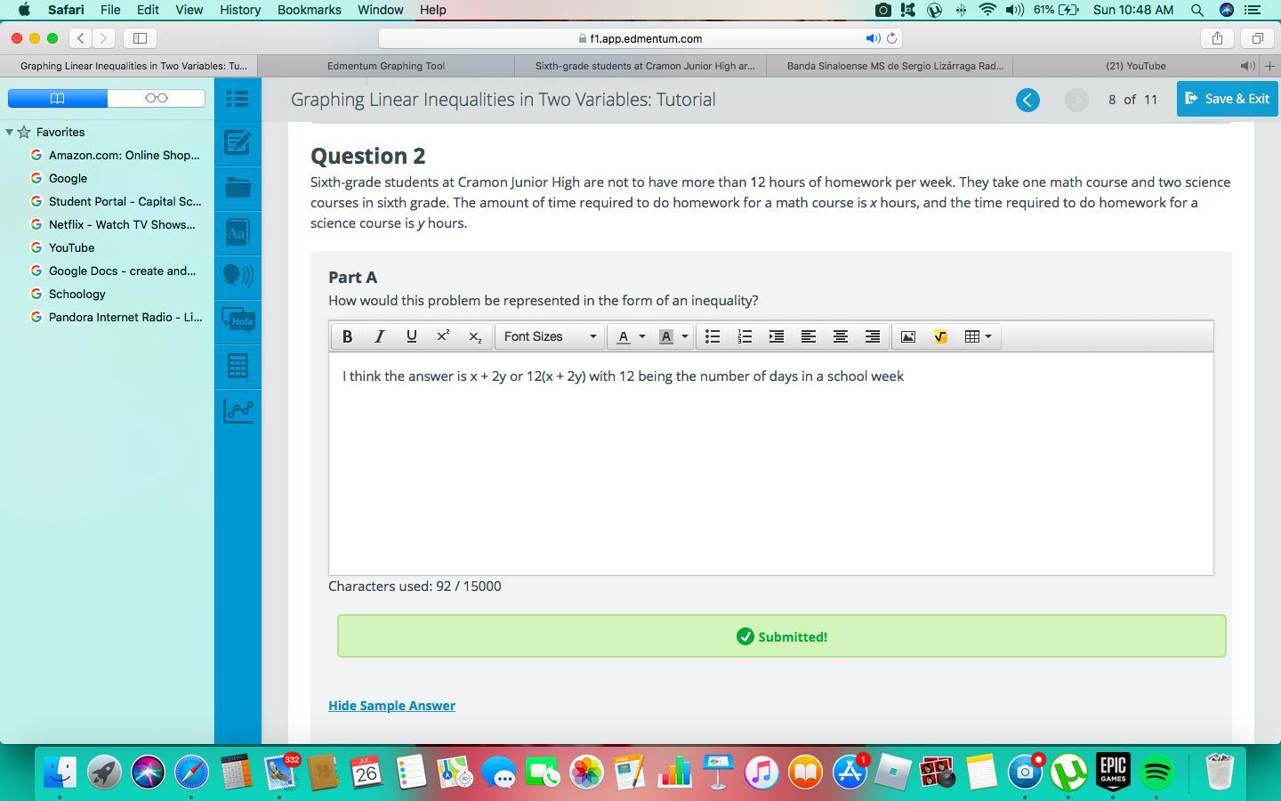 Part A: The total hours of homework have to be 12 hours, and it has to be either 12 hours or less. So, we have ≤ 12.