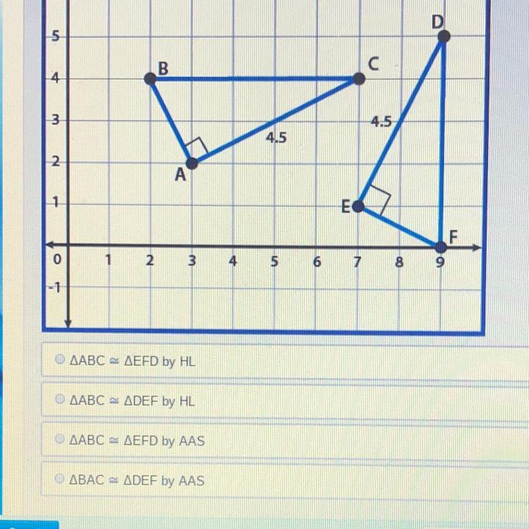 Checking the shapes given , they both have hypotenuse and the same leg is being given , the hypotenuse Leg theorem also states that any two right triangles that have a congruent hypotenuse and a corresponding, congruent leg are congruent triangles.