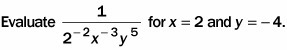 To evaluate the expression, substitute x = 2 and y = -4. Then use exponent rules to simplify. Review the rules here: