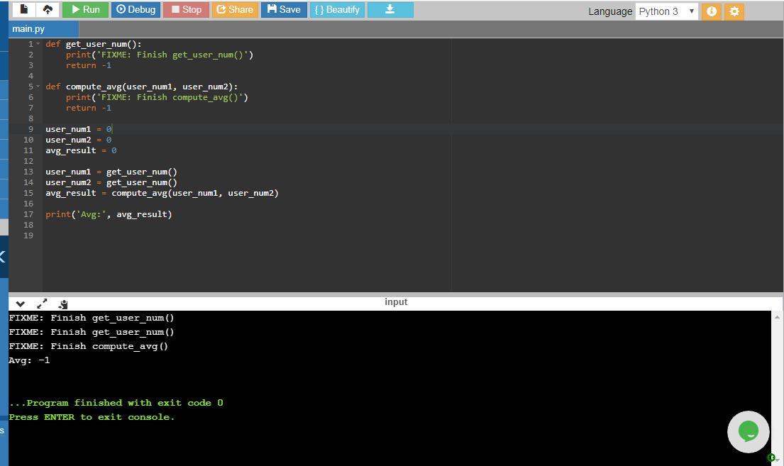 Here with each print statement, there is function name after this FIXME: Finish line. The first function name is get_user_num and the second is compute_avg().