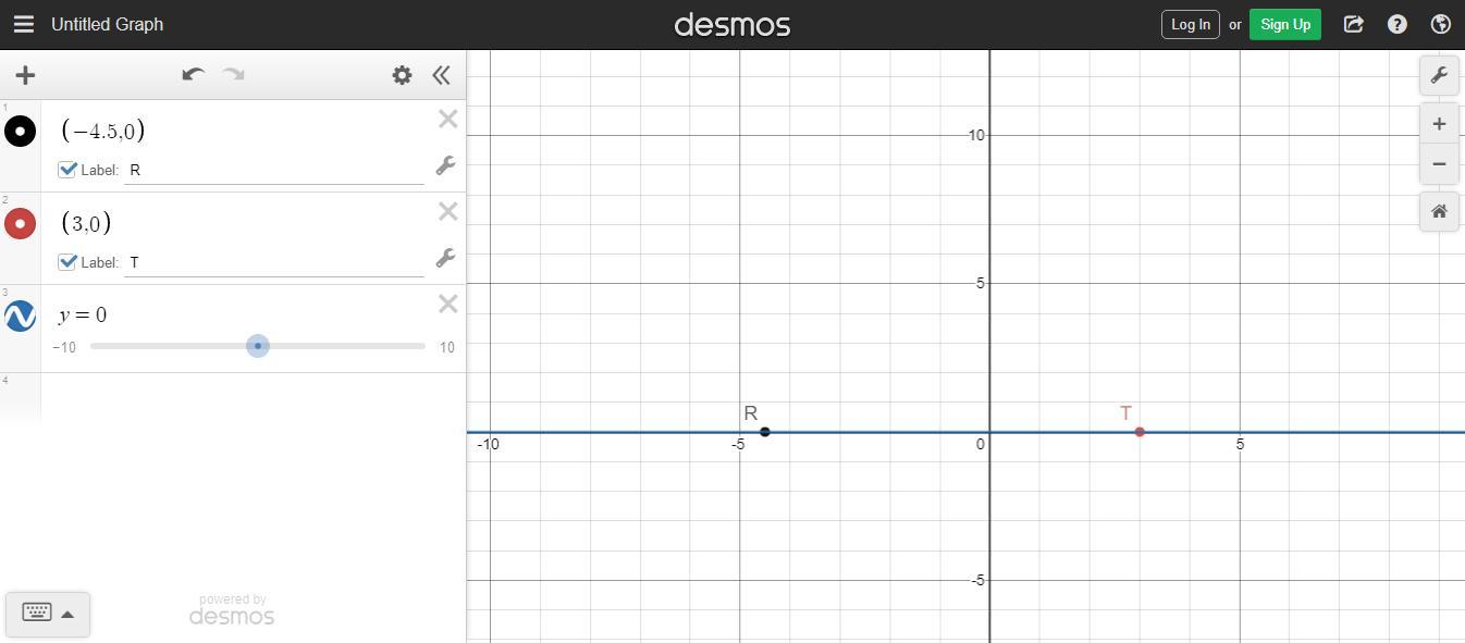 The points given are (-4.5,0) and (3,0), which means the points are on the x-axis. Point R (-4.5,0) will be located to the left of 0, the negative side of the number line between the 4th and 5th marks. Point T (3,0) will be located to the right of 0, the positive side of the number line at the 3rd mark.