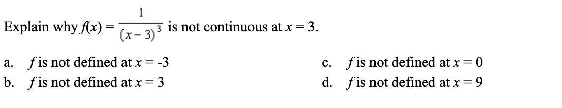 Explain why f(x)= 1/(x-x3)^3 is not continuous at x = 3.