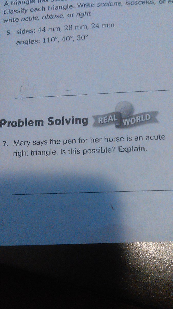 (b) Cannot make a triangle. The triangle inequality theorem says that adding any two sides of a triangle must result in a value larger than the third side. Add up the first two sides (1 and 2) to get 1+2 = 3, which is not larger than the third side (3 units long). I recommend cutting out strips of paper that are 1 inch, 2 inches and 3 inches long, and trying to form a triangle. You'll find that a triangle is not possible. The 1 inch and 2 inch strips will line up to form a straight line that is 3 inches long, and basically you have a flat line (or a triangle with area 0)