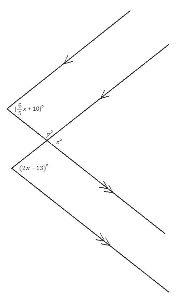 1.\frac{6x}{5}+10^{\circ}+y^{\circ}=180^{\circ}\\\\y=170^{\circ}-\frac{6x}{5}\\\\2.y^{\circ}+z^{\circ}=180^{\circ}\\\\z^{\circ}=(2x-13)^{\circ}\\\\y^{\circ}+(2x-13)^{\circ}=180^{\circ}\\\\170^{\circ}-\frac{6x}{5}+(2x-13)^{\circ}=180^{\circ}\\\\ \frac{4x}{5}=10^{\circ}+13^{\circ}\\\\\frac{4x}{5}=23^{\circ}\\\\ x=\frac{115}{4}{\circ}\\\\ x=28 \frac{3}{4}\\\\y=170^{\circ}-\frac{6\times 115}{5 \times 4}\\\\y=170^{\circ}-34.50^{\circ}\\\\y=135\frac{1}{2}^{\circ}\\\\z=180^{\circ}-y^{\circ}