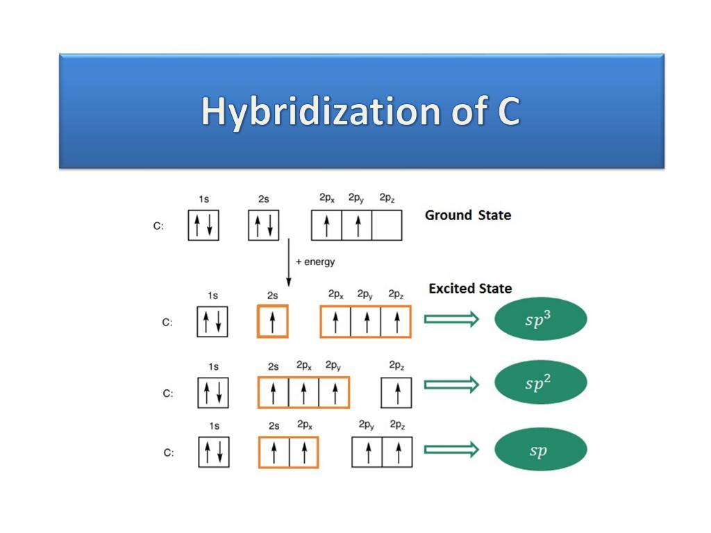 In an atom, C hybridization occurs where the electrons in the 2s orbitals are excited into the 2p orbitals to form sp³ hybridization orbitals so that 4 single electrons can bind to other atoms
