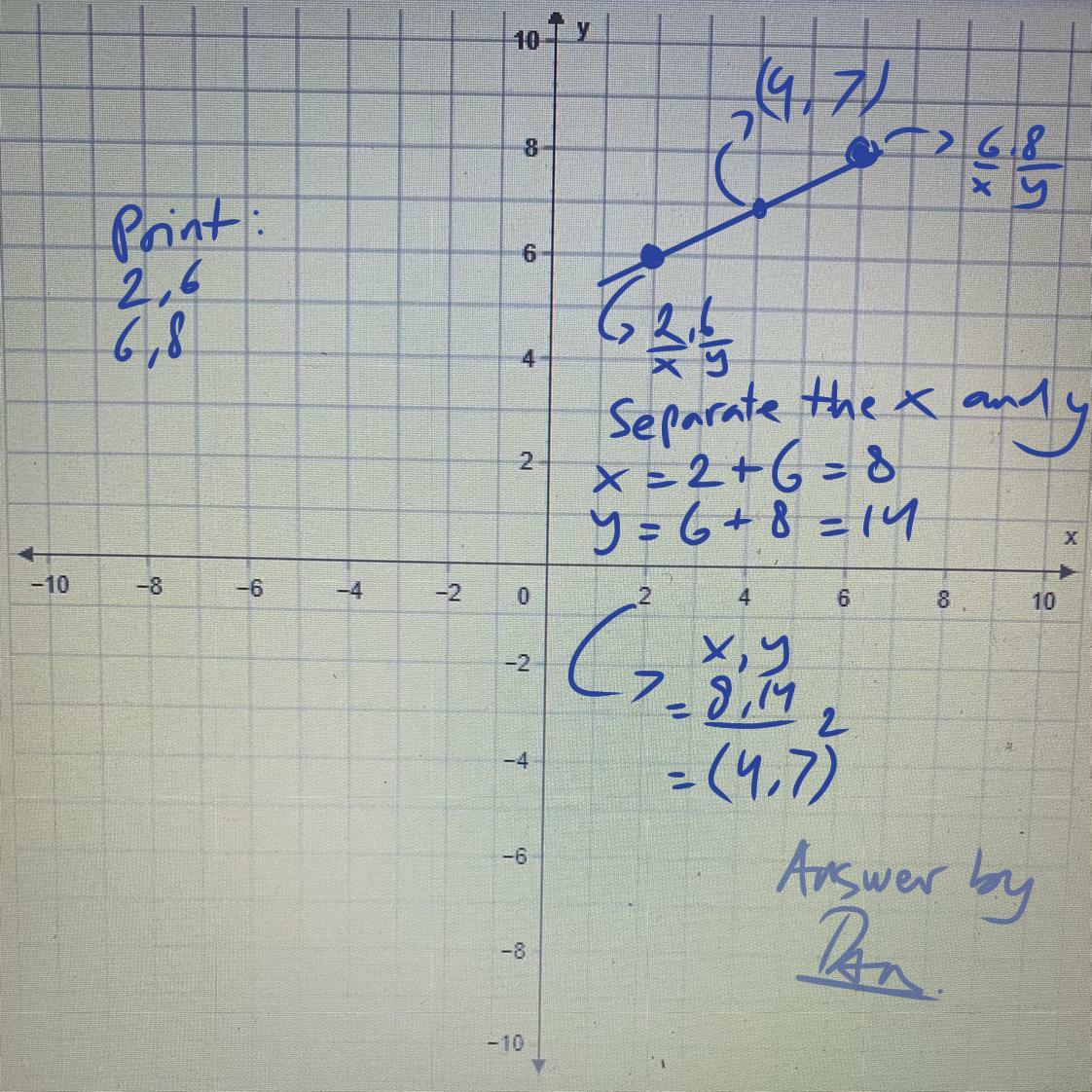Separate the x and y from the endpoint. Then add the x and y. And seoarate it again. Don't substract, but do add. Divide by 2 because midpoint is a point where you divide one line by 2.