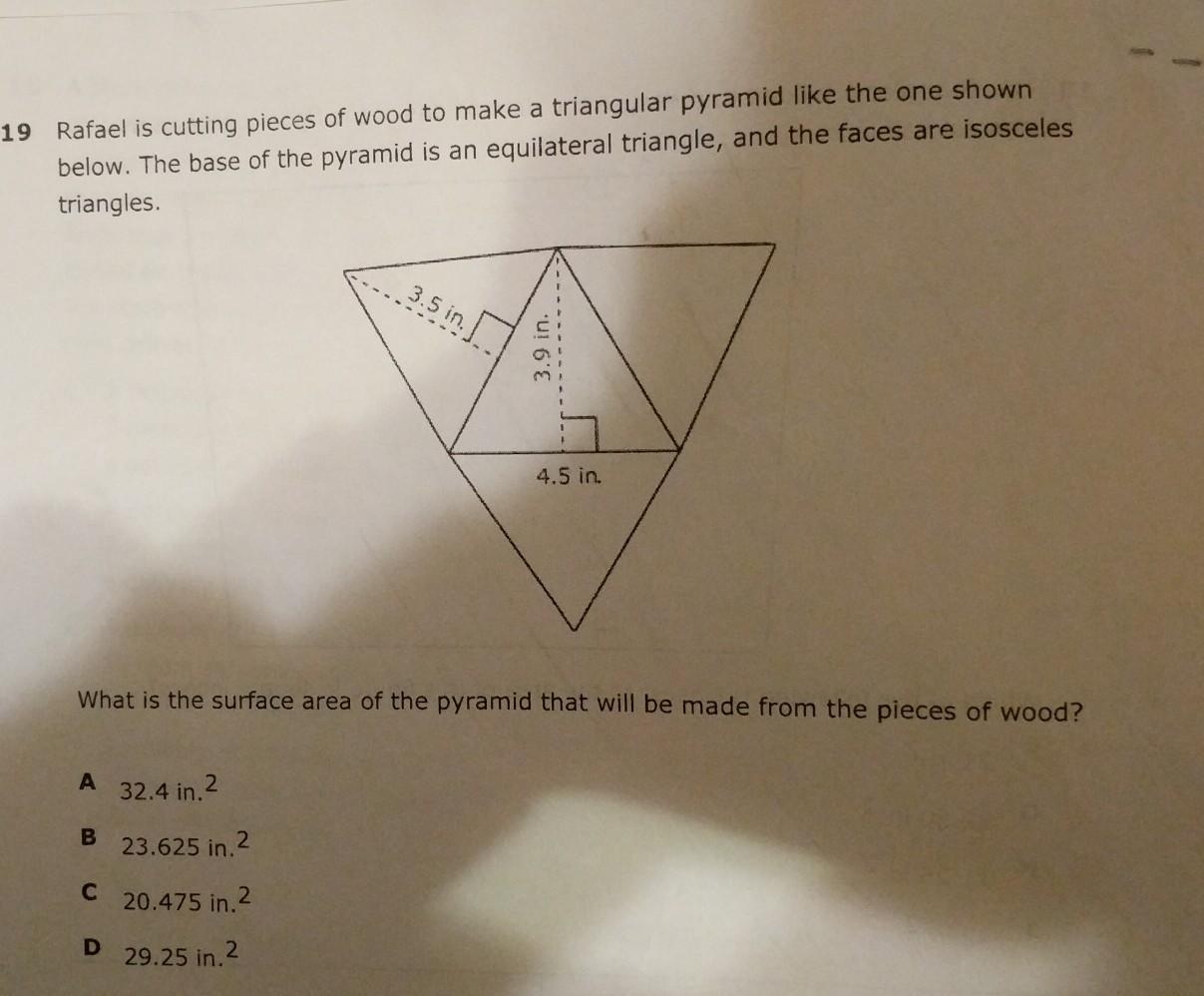 first replace the l with 3.5, the slant height. then find the perimeter of the base (p) by multiplying 4.5 by 3.