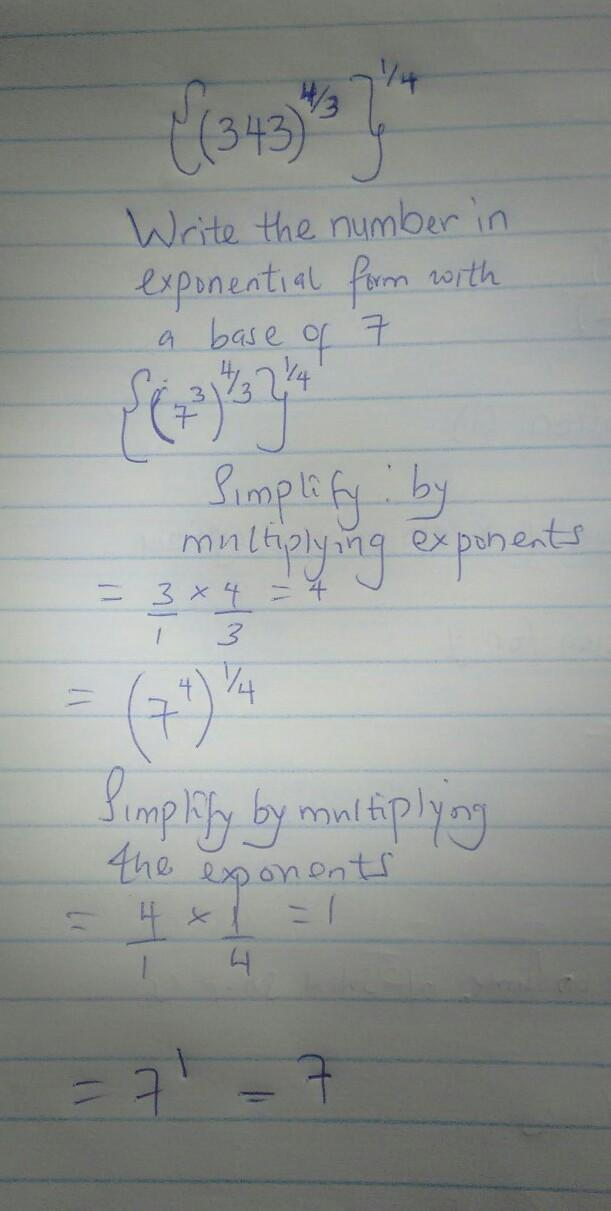 {((343 ^{ \frac{4}{3} })) }^{ \frac{1}{4} }  \\  = ( {7}^{3} ) ^{ \frac{4}{3} } ) ^{ \frac{1}{4} }  \\  = ( {7}^{4} ) ^{ \frac{1}{4} }  \\