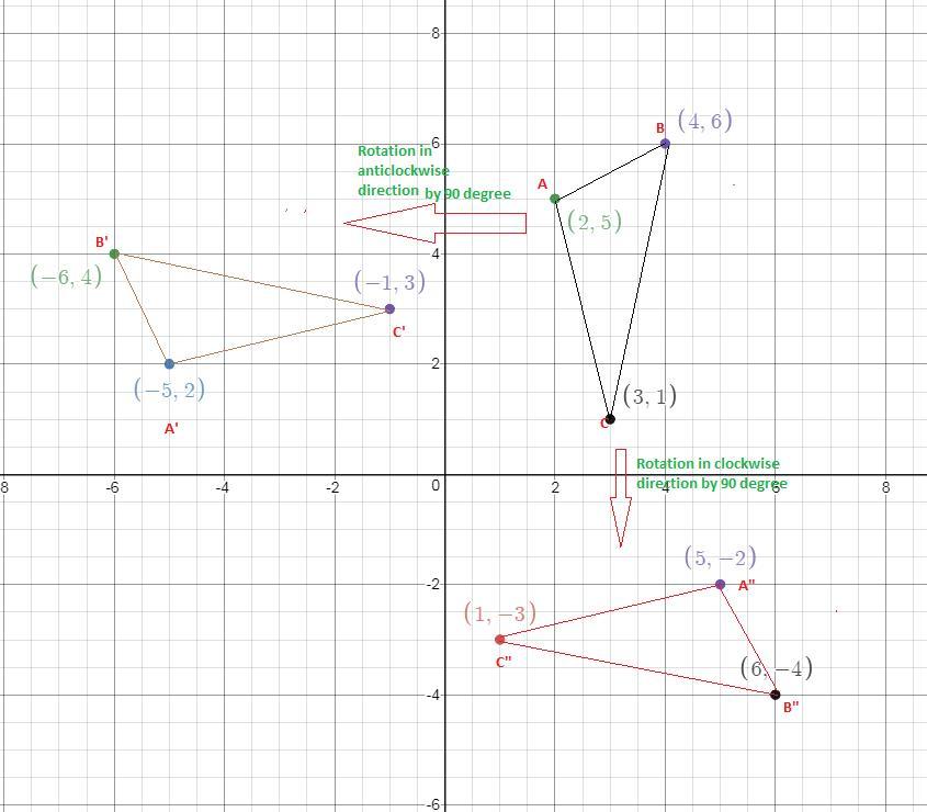 of triangle with vertices A(2, 5), B(4, 6) and C(3, 1) with the rule r(90°, o) are A'(5, -2),