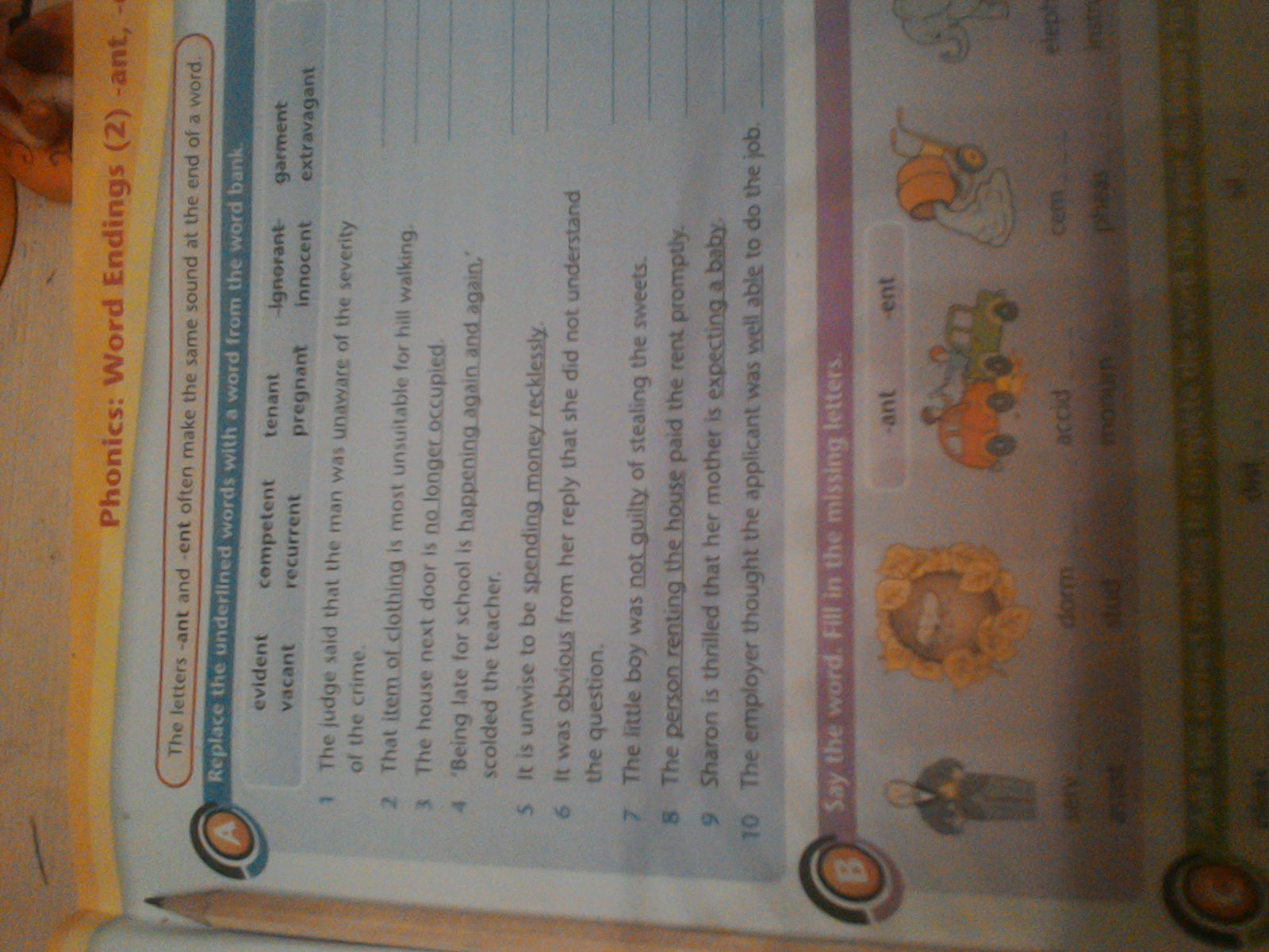 Alrighty, so: First it helps if you know what each word means. 1.) Ignorant. Ignorant means unaware. 2.) Garment. A garment is an article of clothing. 3.) Vacant. Vacant means unoccupied. 4.) Recurrent. Recurrent means to repeat. 5.) Extravagant. Over the top. 6.) Evident. Evident means noticeable. 7.) Innocent. Innocent means not guilty. 8.) Tenant. A tenant is someone who rents a house. 9.) Pregnant. That woman is preggers. 10.) Competent. Means you're able to do something well.
