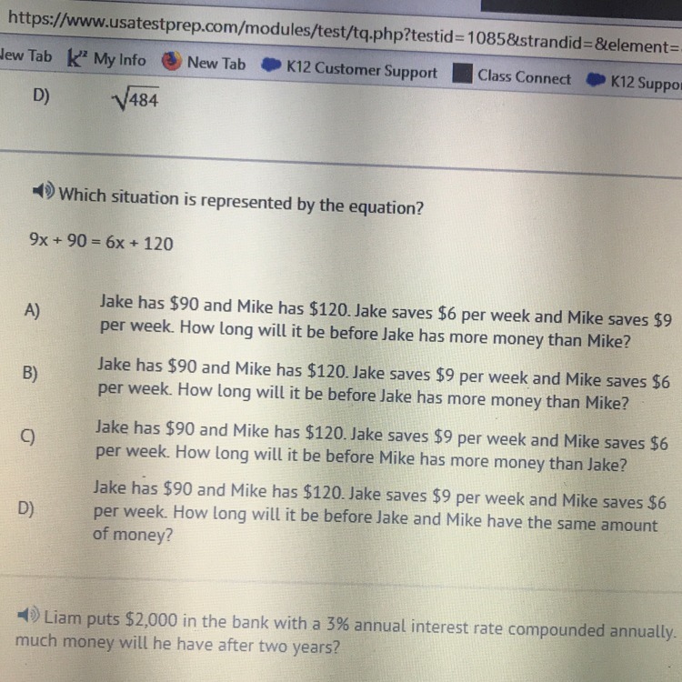 D.) Jake has $90 and Mike has $120.Jake saves $9 per week and Mike saves $6 per week. How long will it be before Jake and Mike have the same amount of money?