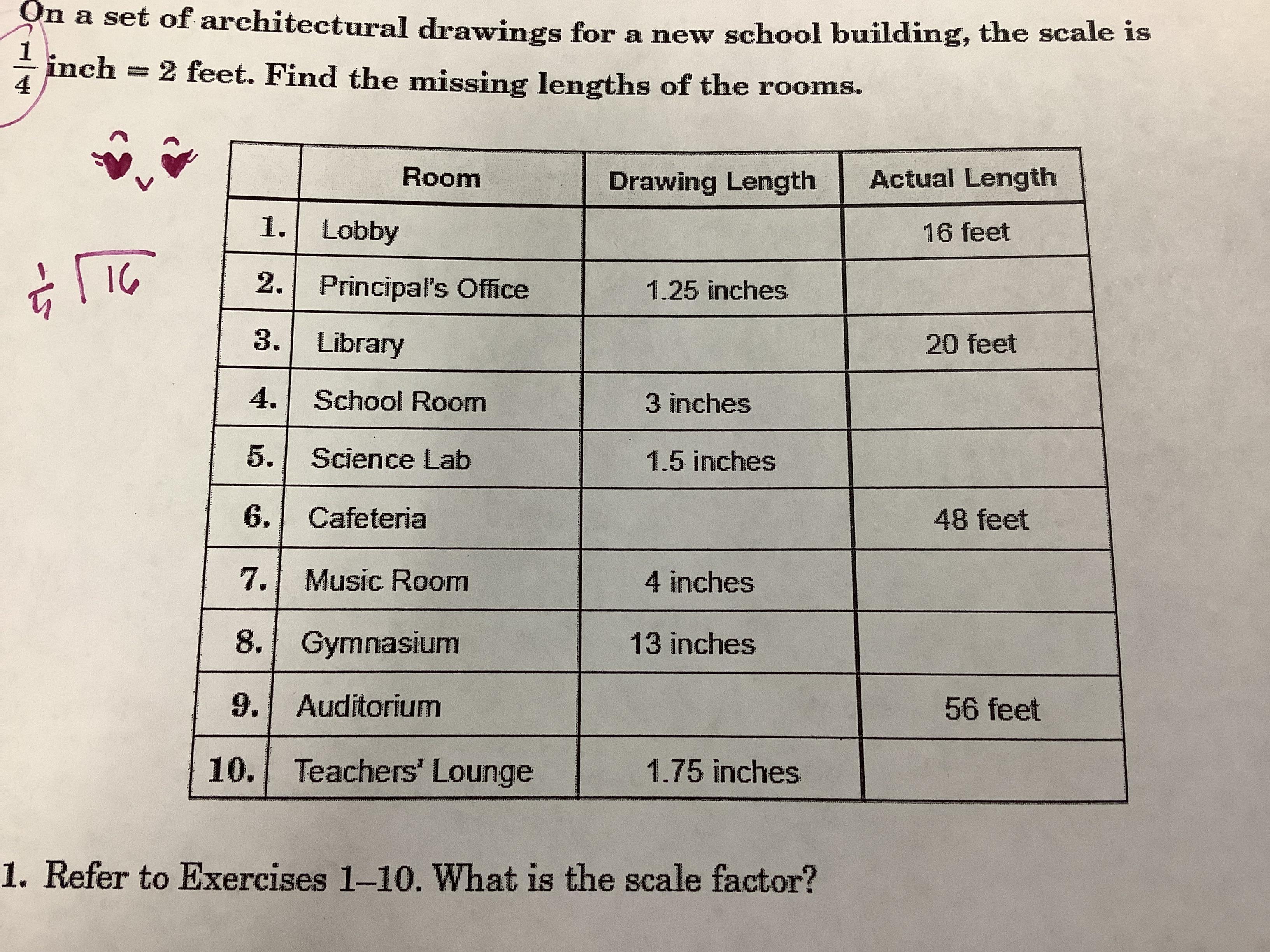 10. The teachers' lounge's actual length is 14 feet.