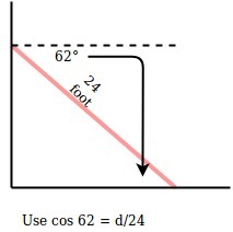 for question 14, we establish that the angle of depression is in that spot there that forms with the dashed lines. then we can say that angle is the same as that angle in the triangle that forms with the ladder. then, since that's a right angle, we use cosine to find the length between the bottom of ladder to the wall