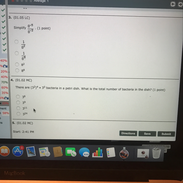 Q3. 8^-5/8^-3 = 8^-5--3 = 8^-5+3 = 8^-2 = 1/8^2 = 1/64.