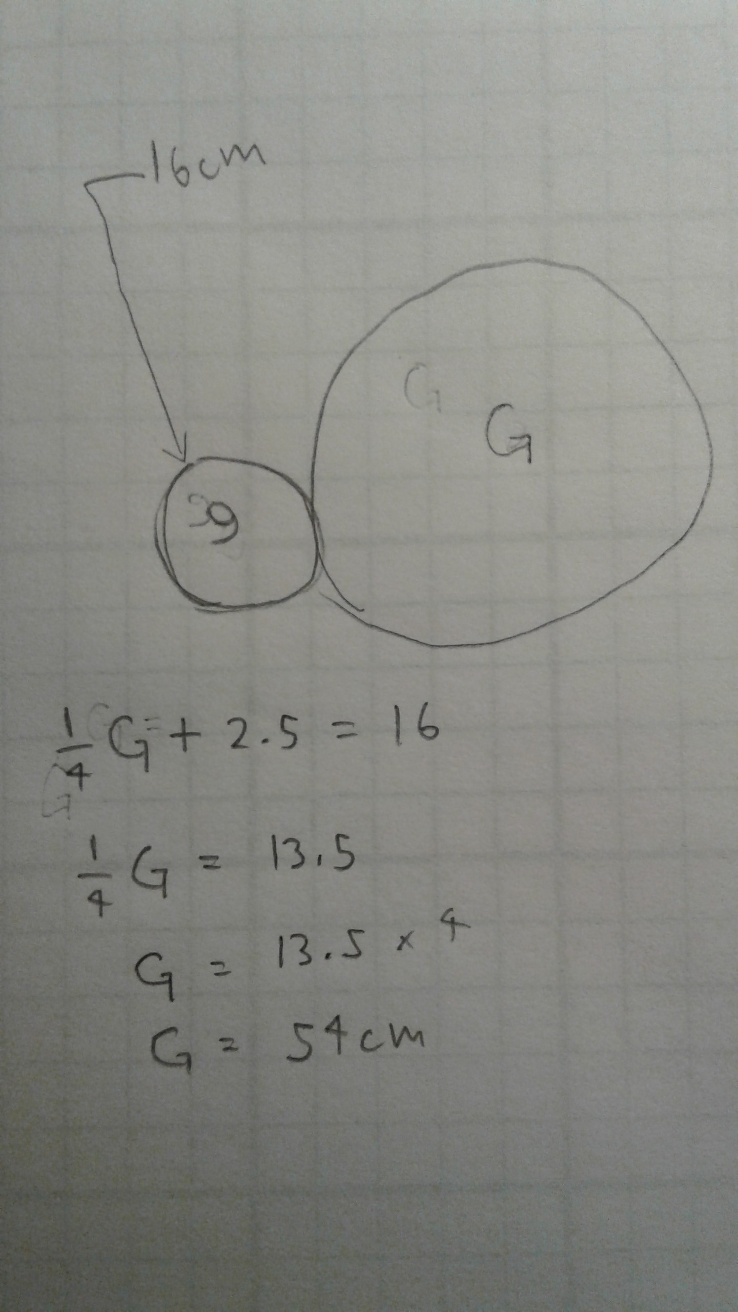 the diameter of a small gear is 16cm. this is 2.5cm more than 1/4 of the diameter of the lager gear. what is the diameter of the