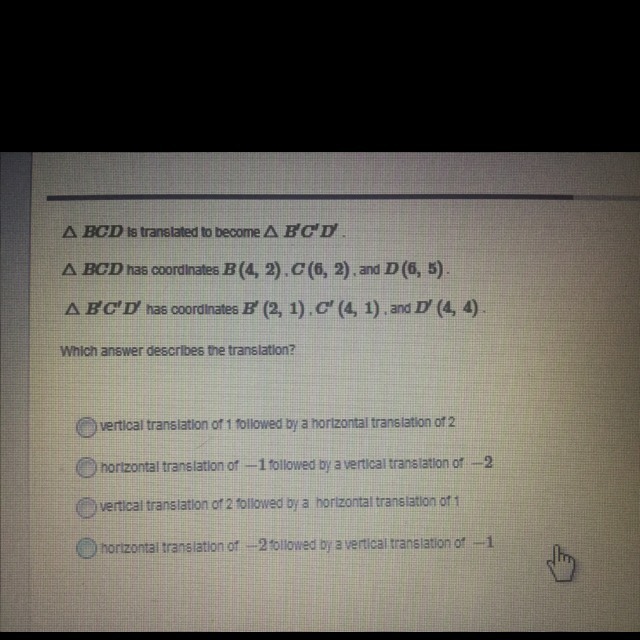 From BCD to B'C'D', vertical (y) translated 1 unit down (-1) and horizontal translated 2 units to the left (-2)