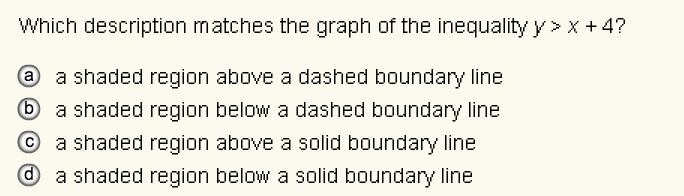 Because the inequality sign is just greater than ( no equal to), the correct answer would be A) a shaded region above a dashed boundary line.