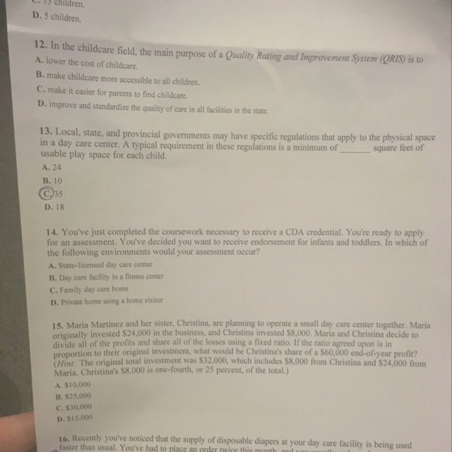 The answers are as follows: 12. D. The principal purpose of a quality rating and improvement system is to improve the quality of the day cares that operate in the state and to establish defined program standards which should be adhere to by the day care operators. QIRS finds ways of assessing, organizing and communicating the quality of early care in child care settings. 14. A. In order to be assessed by the CDA for the infant- toddler category, a government approved center based infant-toddler location has to be chosen. To be properly assessed, at least a group of at least three children, who are under the age of three years old must be present. The candidate been assessed will be scored based on his interaction with these children. 15. D Maria invested $24,000 while her sister, Christiana invested $8,000 for a total of $32,000. The ratio of their investment is as follows: Maria ratio = A * $32,000 = $24,000 where A is the ratio of maria investment, A = $24,000/ $32,000 = 3/4 Therefore the ratio of Maria investment is 3/4 Christiana ratio = B* $32,000 = $ 8,000 B = $8,000/ 32,000 = 1/4. To share a profit of $60,000 based on their investment ratio, Mary will have 3/4 * $60,000 = $45,000 while Christiana will have 1/4 * $60,000 = $15,000. Therefore the correct option is D.