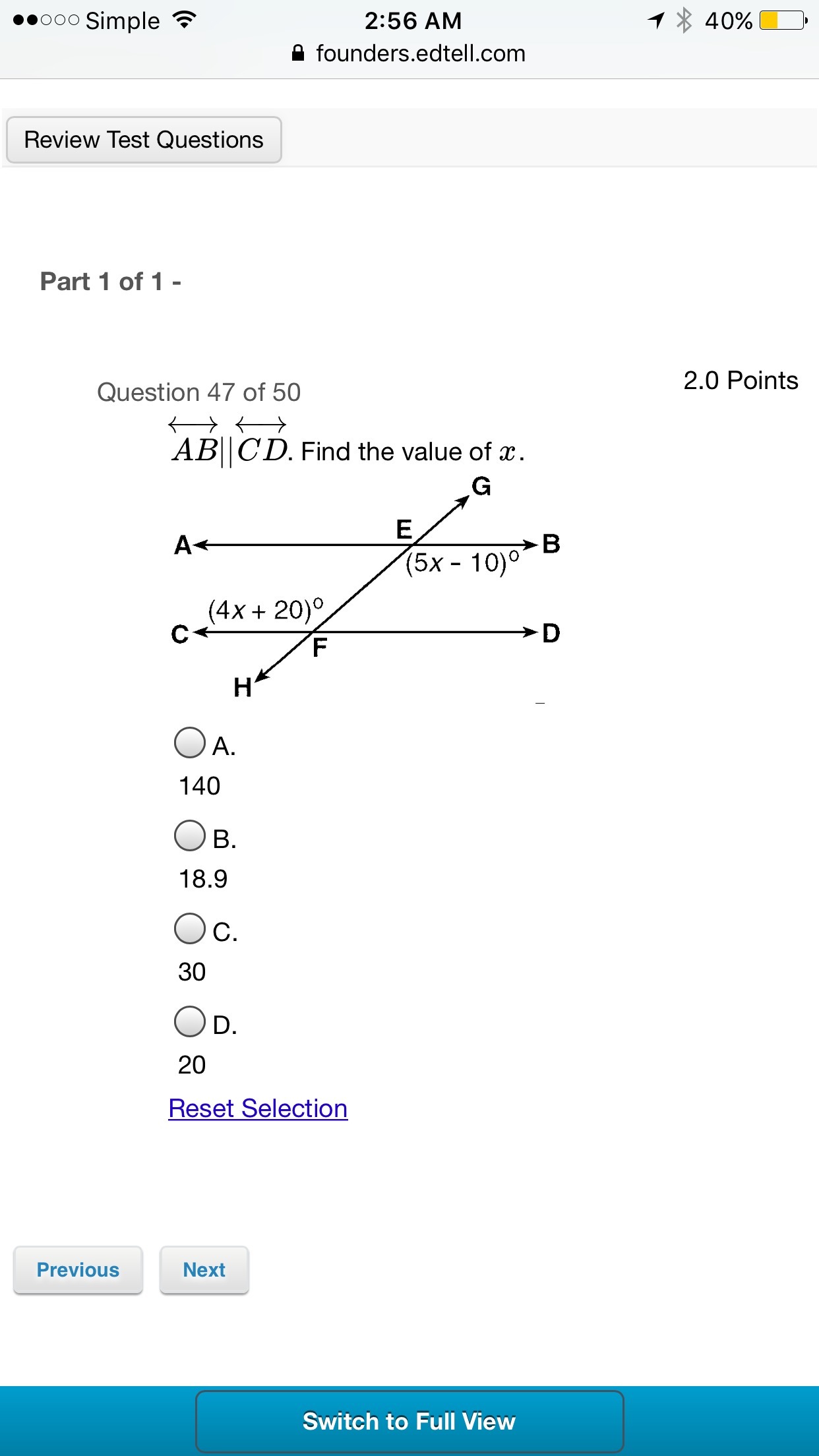 The angles marked 5x-10 and 4x+20 are alternate interior angles.
