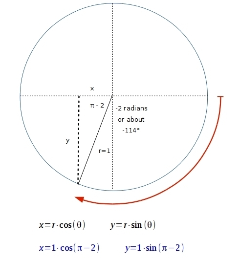in case you're wondering, in the Unit Circle, the radius is 1, and due to that, the arc's length, in this case an arc of 2 units, is the same value as the angle it makes in radians, so, if the arc is 2, then the angle it makes, in this case clockwise, in the direction as a clock moves, or a negative angle of -2 radians then.