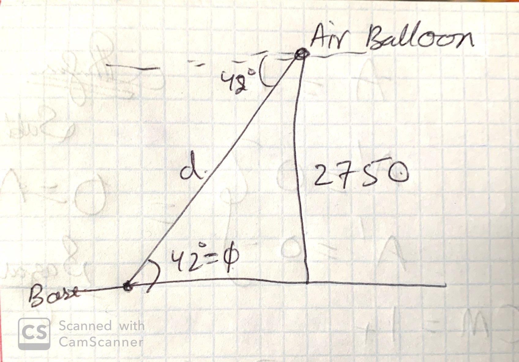 Perpendicular = 2750 and Hypotenuse is the distance (d) from basket to the base of silo, and Ф = 42 degree as given