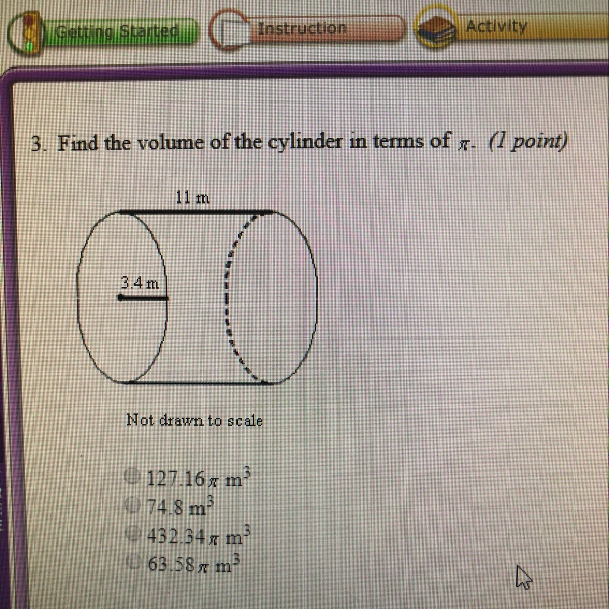 Thus, the volume of the cyl. is pi*(3.4 m)^2*(11 m).  Can y ou evaluae that?  Use 3.14 for the pi value.