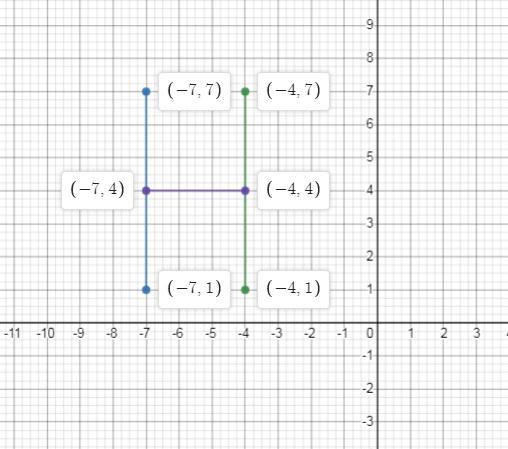 Plot the points (–7, 7) and (–7, 1) on a coordinate plane and joint them. Similarly make the line segment (–4, 7) to (–4, 1) and (–7, 4) to (–4, 4).