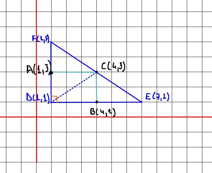 Let A be the midpoint of DF. The x coordinate of A is 1 and the y coordinate can be found as follows: