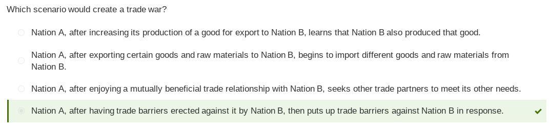 Nation A, after having trade barriers erected against it by Nation B, then puts up trade barriers against Nation B in response.