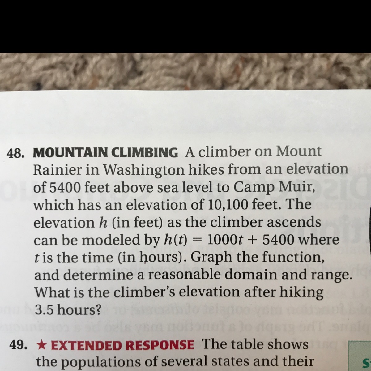 the domain, INPUT, is from 0, up to whatever long it takes her to get to mount Muir, so from 5400 to 10,100 is 4700 feet, now, she does 1000 every hour, so is 4 hours and 0.7 or 42 minutes, so she'd take 4 hours and 42 minutes.