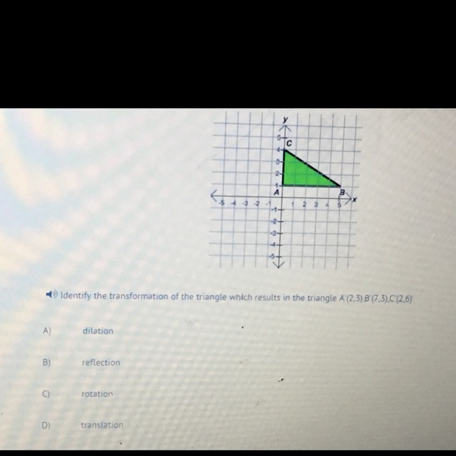 I did problems like that by marking the coordinates. For example it says A was at (2.3), so you’d go over 2 and up 3. Then you’d do the same for points B and C. After that you would connect the dots with lines, and it would show that both triangles are the same size meaning that it couldn’t be a dilation, since that would make the triangle be either bigger or smaller in size. The triangles would be facing the same direction, so it couldn’t be reflected over anything or rotated. The answer would be D) translation, because the image of the triangle was translated to the right 2 and up 2 for all of the points.