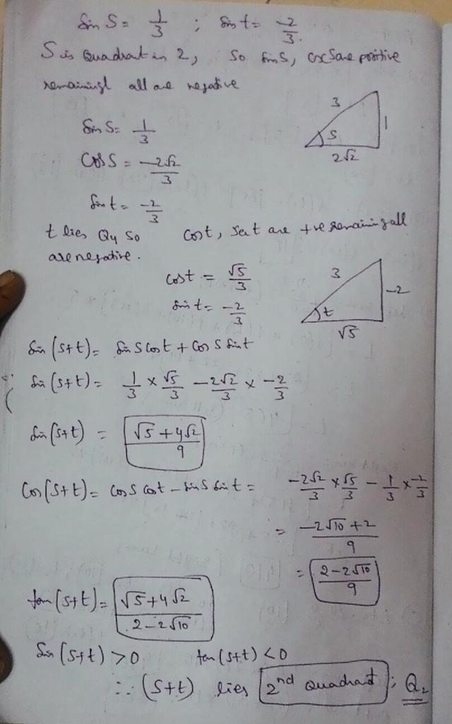(c) sin (s + t) lies in the first quadrant because its value is a positive number and sine is positive in the first or second quadrant.