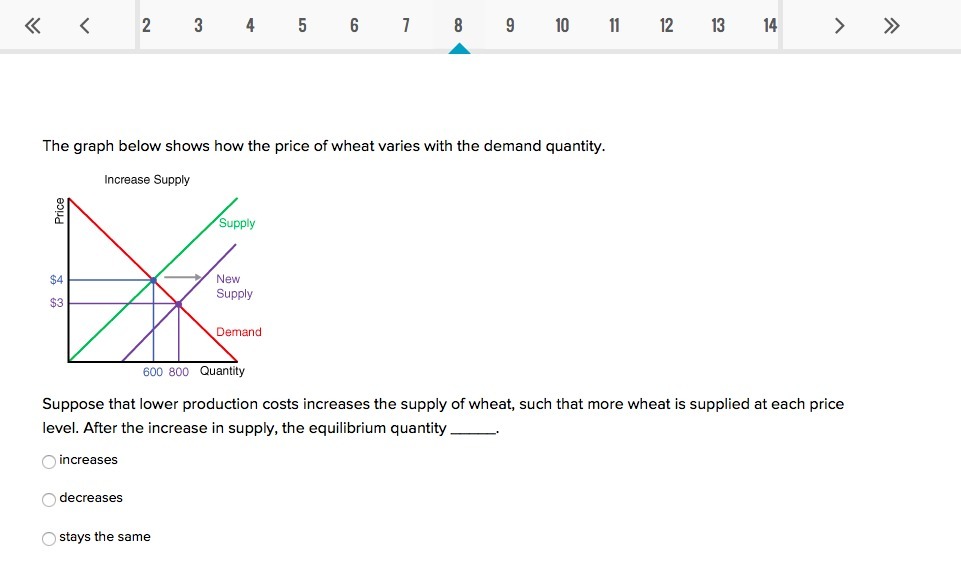 When the production cost lowers from $4 to $3, the supply of wheat increases, such that the equilibrium quantity increases from 600 units to 800 units.