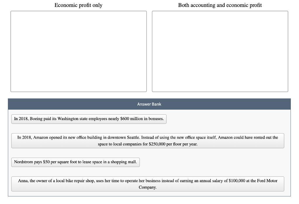 In 2018, Amazon opened its new office building in downtown Seattle. Instead of using the new office space itself, Amazon could have rented out the space to local companies for $50,000 per floor per year.--->economic profits only