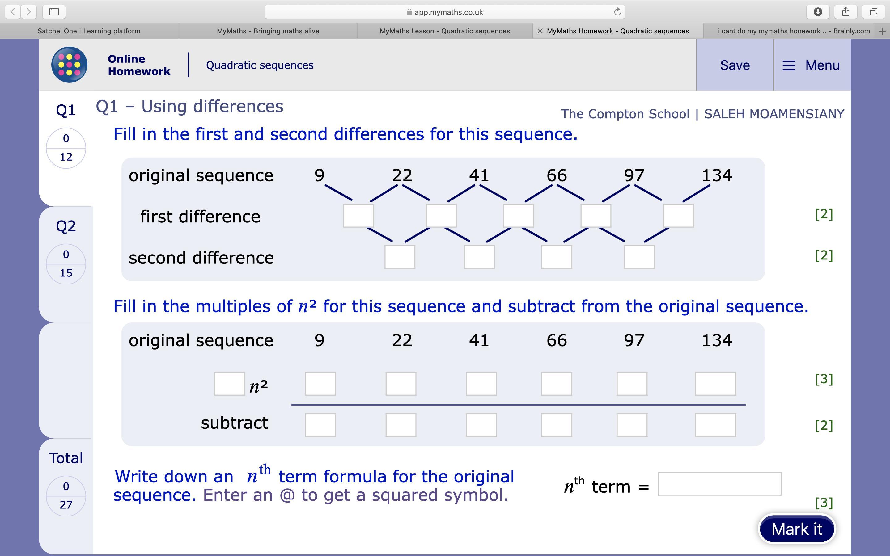 In the quadratic case, the coefficient of n² is half the second difference. So I'm writing a 3 in there.
