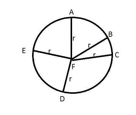Since F is the center of the circle and the points A, B, C, D, and E are on the circle, therefore the line segments FA, FB, FC, FD and FE radius of the circle F.