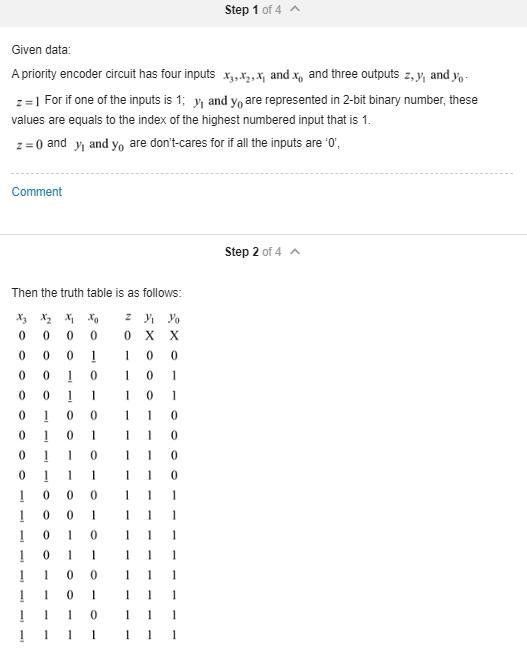 presentsthe2-bit binary number whose value equals the index of the highest X which is on. For example, if X2=1 and X3=0, then the output are z=1, y1=1 and y0=0. if all input are 0, z=0 and y1 and y0 are dont-cares.