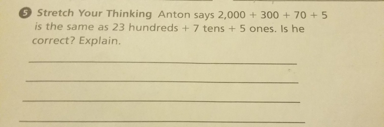 Stretch Your Thinking, Anton says 2,000+300+70+5 is the same as 23 hundreds + 7 tens + 5 ones. Is he correct? Explain (homework)