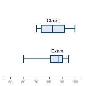 So, from the above figures we can see that the Median for the Class Data is around 82 and the median for the Exam Data is around 87. It is clear that the Median of Exam data is higher than the Median of Class Data.
