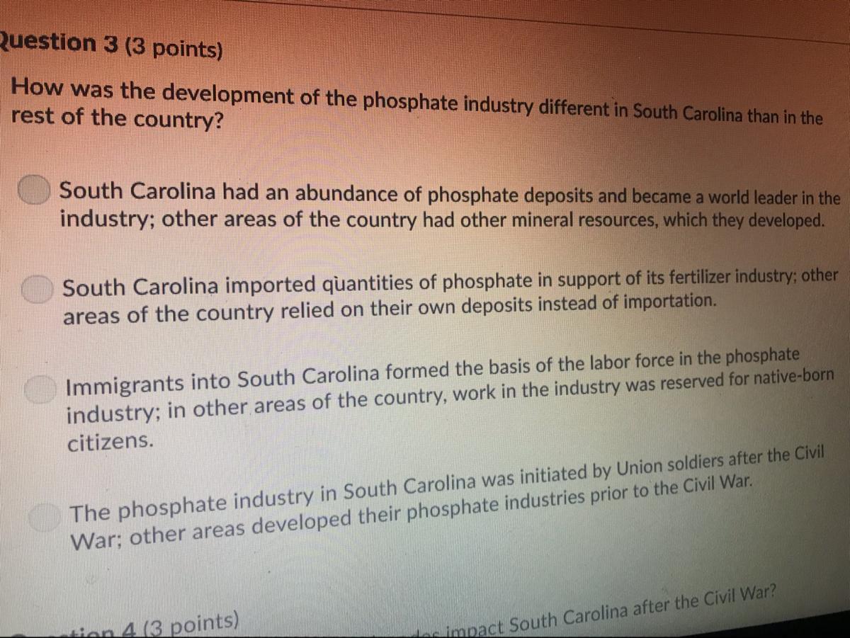 South Carolina had an abundance of phosphate deposits and became a world leader in the industry: other areas of the country had other mineral resources, which they developed.