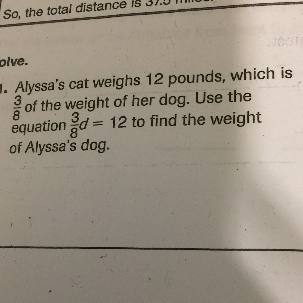 (3/8)d=12 d=12(8/3) d=32 Alyssa's dog weighs 32 pounds