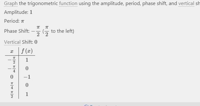 Graph the trigonometric function using the amplitude, period, phase shift, and vertical sh Amplitude: 1 Period: it