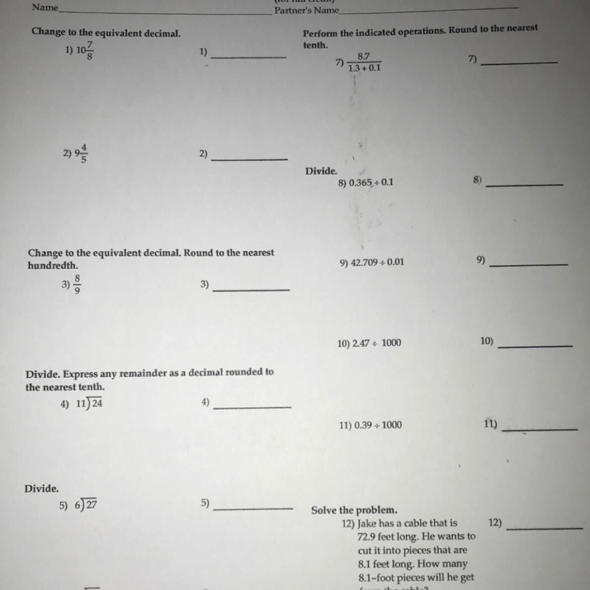 1. To get the decimal, you divide 8 by 7 and add that to the back of ten. One eighth is .125. .125*7= 0.875, so your answer is 10.875.