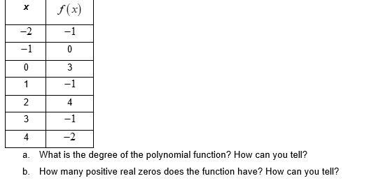 From the table we can see that the value of the polynomial function is first negative, then positive (1 intersection with x-axis), then again negative (second intersection with x-axis), then again positive (third intersection with x-axis), and at last again negative (fourth intersection with x-axis).