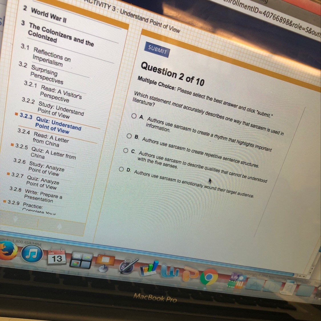 The statement that most accurately describes one way that sarcasm is used in literature is<em> authors use sarcasm to emotionally wound their target audience</em>. Sarcasm is a literary device that is used to mock someone and to hurt the target audience. It is a form of nonliteral language that is used to communicate the opposite of what is said. Sarcasm is a form of irony. Sarcastic comments are used to criticize someone or some section of society.