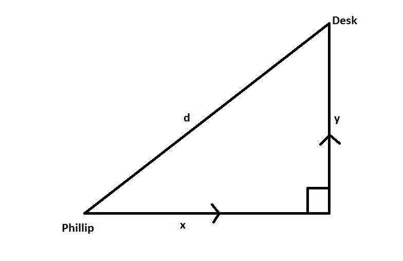 From the diagram attached to the answer we may clearly observe that the shortest path from Phillip's original position to his desk could be calculated with the help of Pythagorean Theorem as: