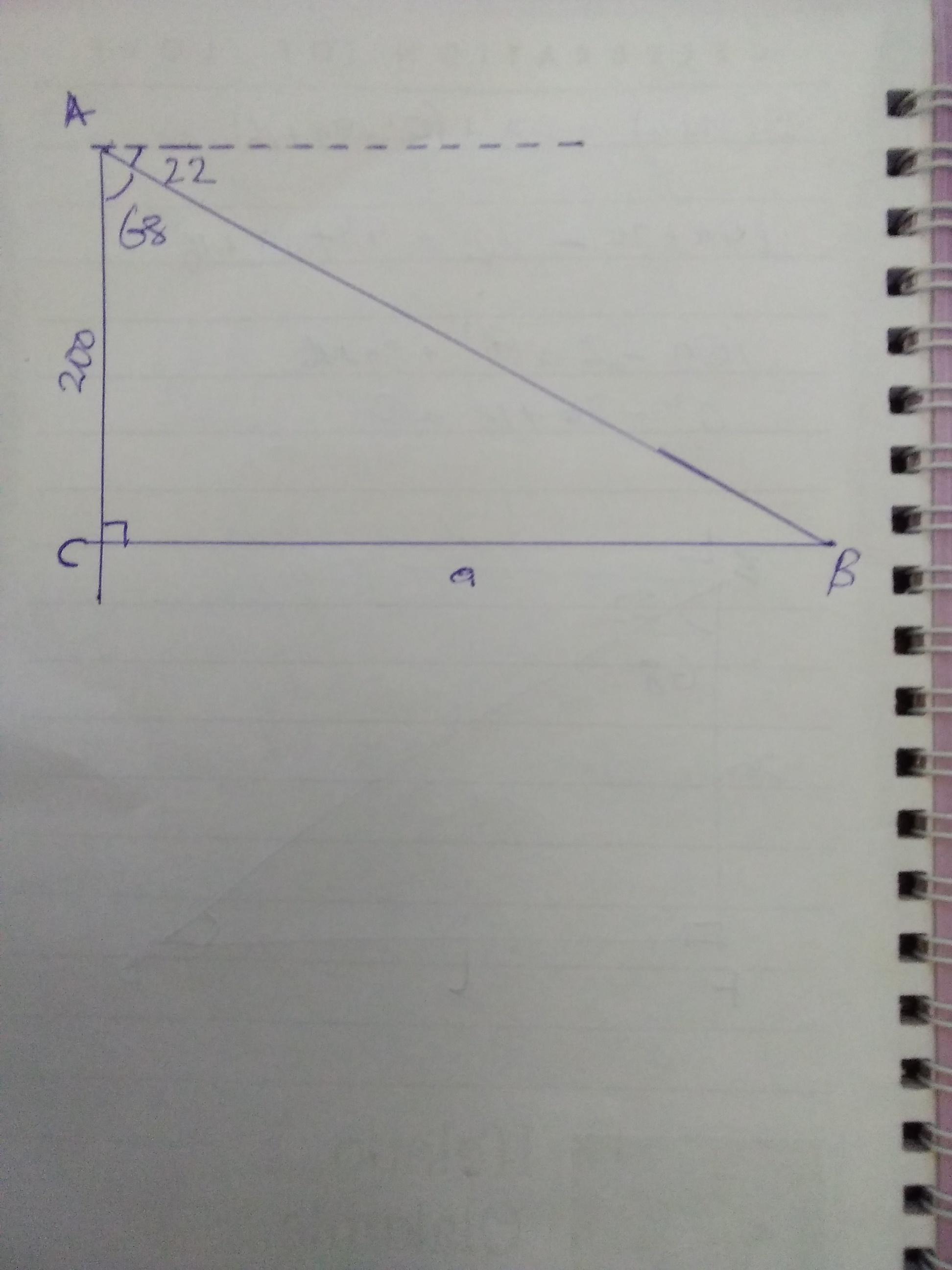 Step-by-step explanation: Please refer to the attached diagram. The angle of depression of the boat is 22°. That makes the point A to form an angle of 68° with the foot of the lighthouse, (point C). The boat is at point B, so the distance from the boat to the lighthouse is line CB (or a).