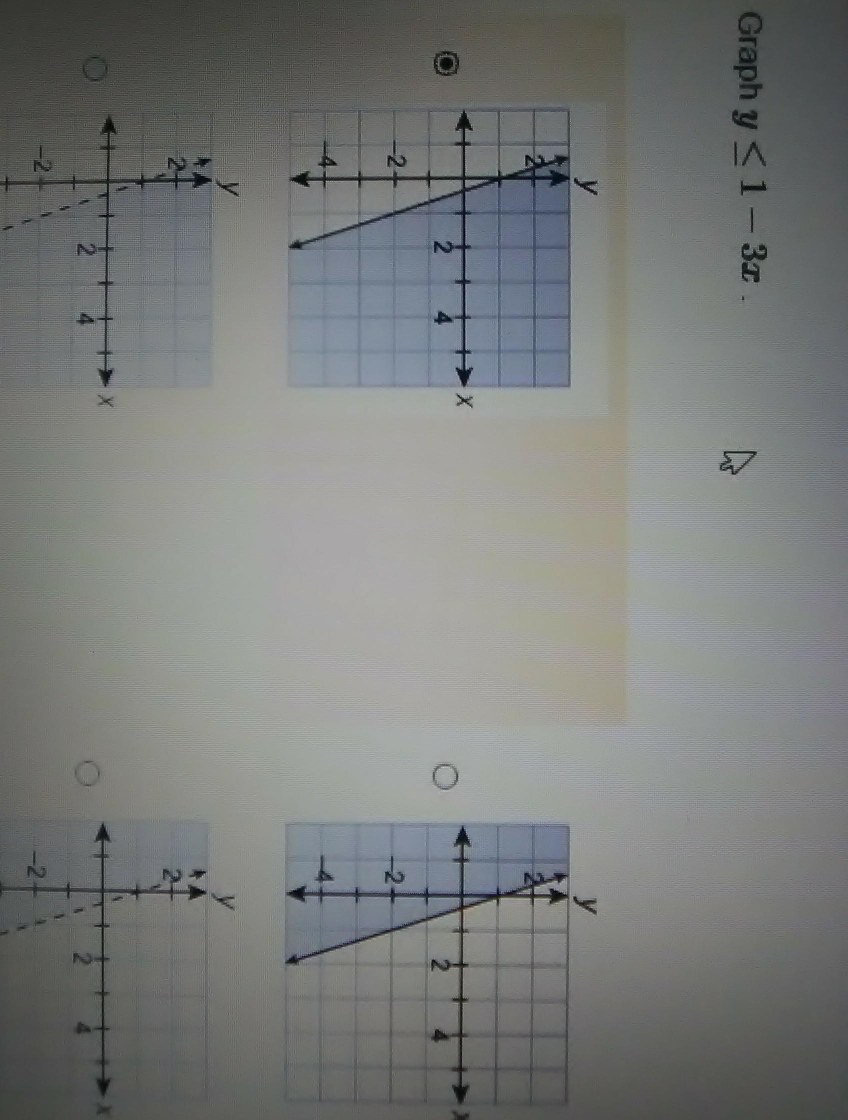 Since the inequality contains an equal sign, the boundary line must be included in the graph (it should appear as solid)then you need the points y that are less (below) those on the boundary line. So you should highlight the half plane below the boundary line.